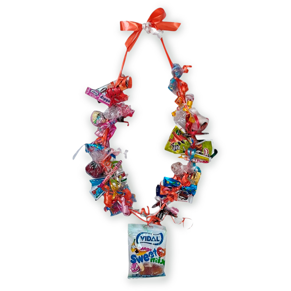 Esta cuelga incluye una mayor variedad y cantidad de chuches, también caramelos ,piruletas y snaks, algunos en formatos más grandes, creando un regalo aún más llamativo, colorido y lleno de sabor.